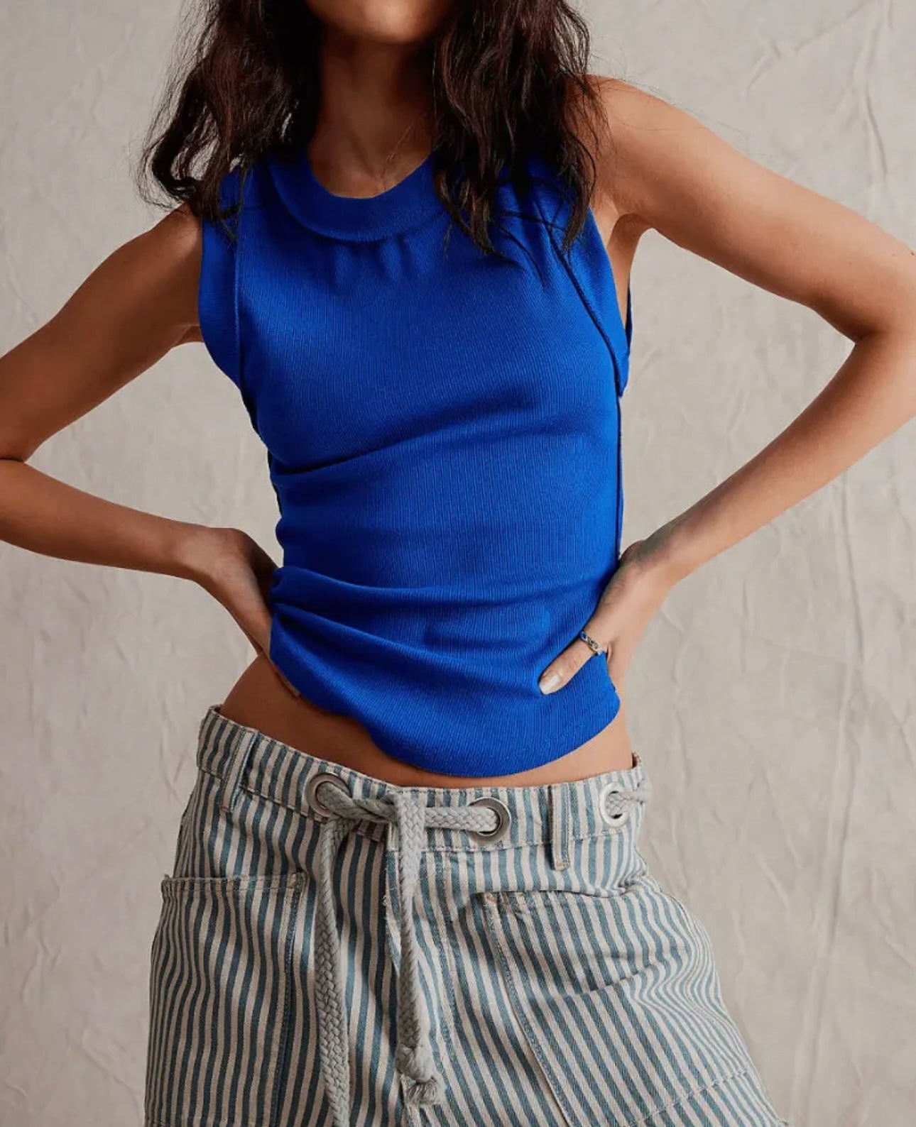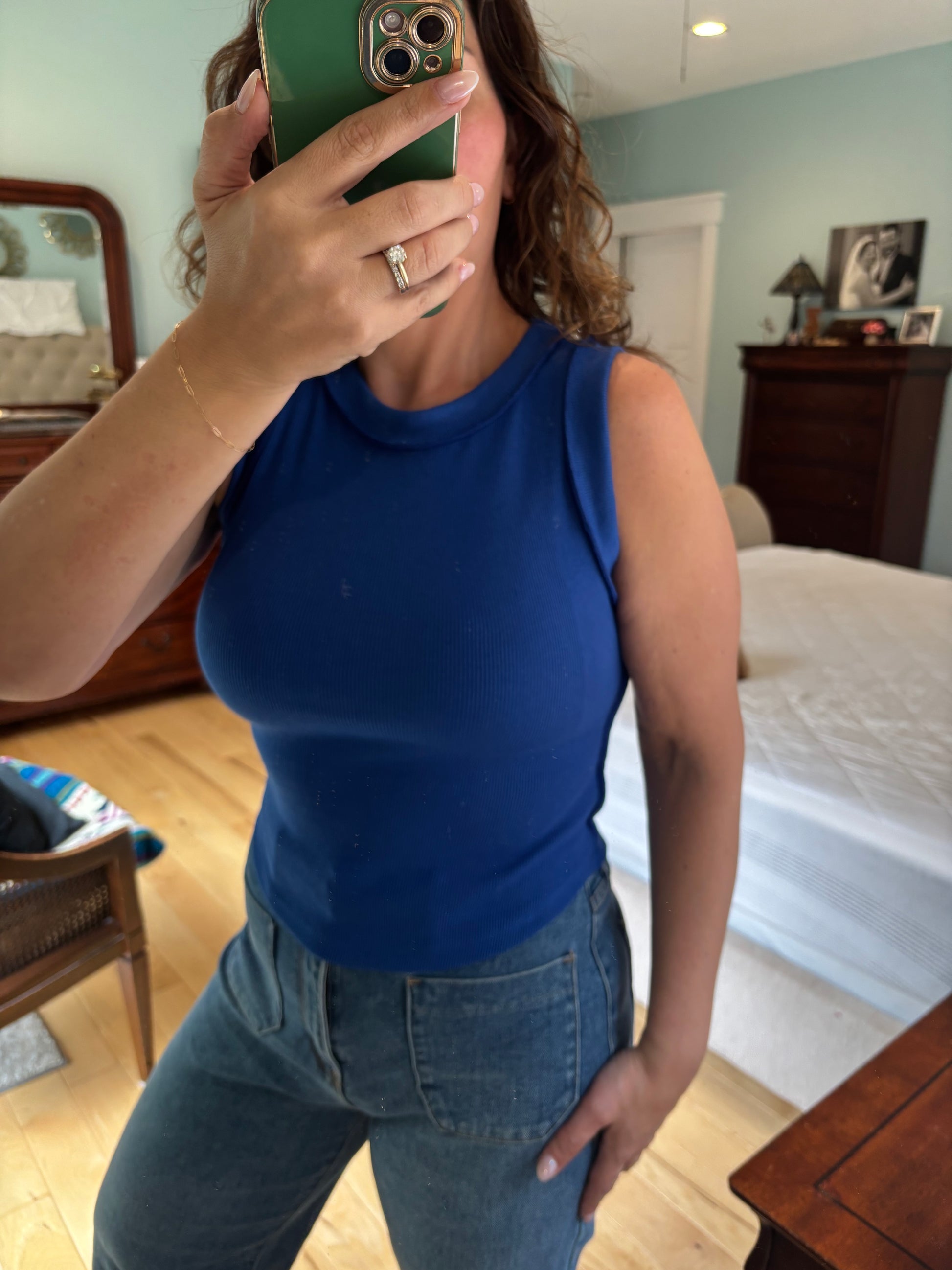 Very stretchy with a moderate compression like feel. Scoop bottom. If you need space in the bust, size up!